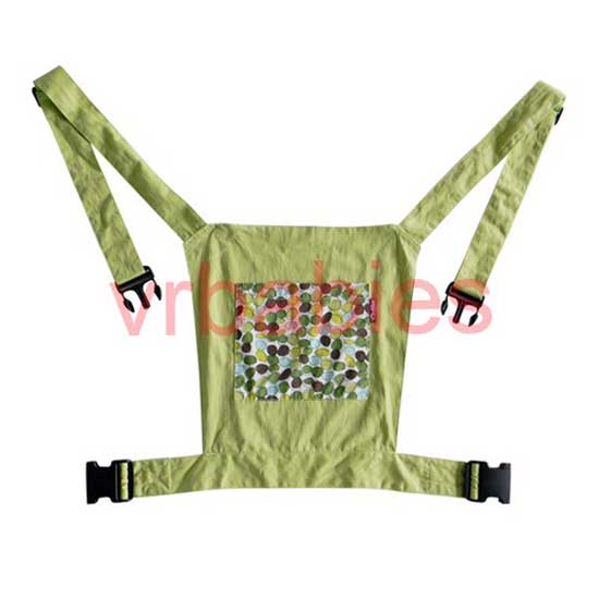 This displayed apple green baby carrier can be worn on front or back. It allows easy access for baby's hands and allows free movement. Foldable and compact, this baby carrier can be carried in a handbag.