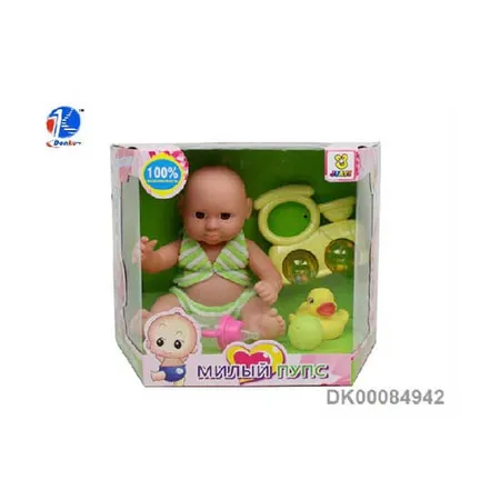 This is an 8" baby doll with assorted kids' bath tools. It is designed with multi-language versions. The doll is dressed in a set of two-toned outfit with stripe patterns.