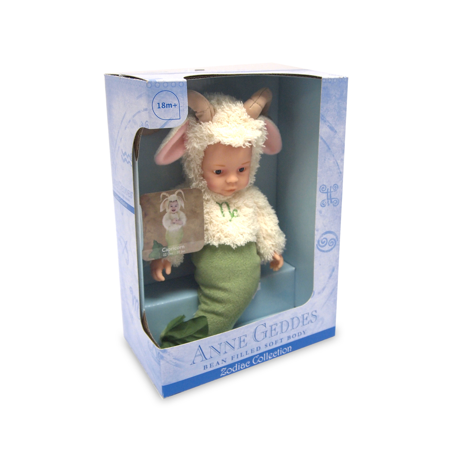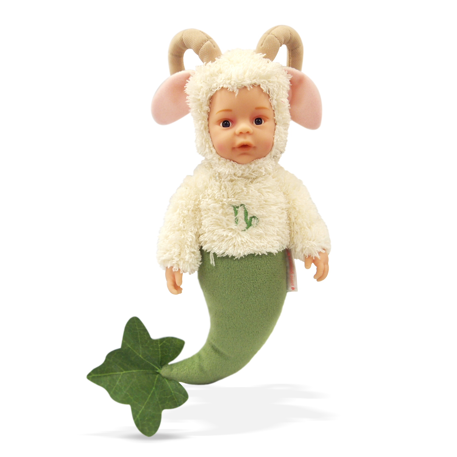Highlighted here is a baby doll with a Capricorn themed design. It has a fluffy goat style upper body and has a fish tail with a leafy fin. This Capricorn doll has a cute pouting expression and is perfect for babies to cuddle with.