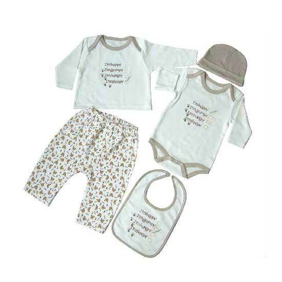 This is a baby gift set including a long-sleeved T-shirt, a pair of pants, a body bib, an adorable hat and a long-sleeved onesie. They are designed with adorable patterns and exquisite words for added style. This baby set is also made of high-quality cotton to promise comfortable wears.