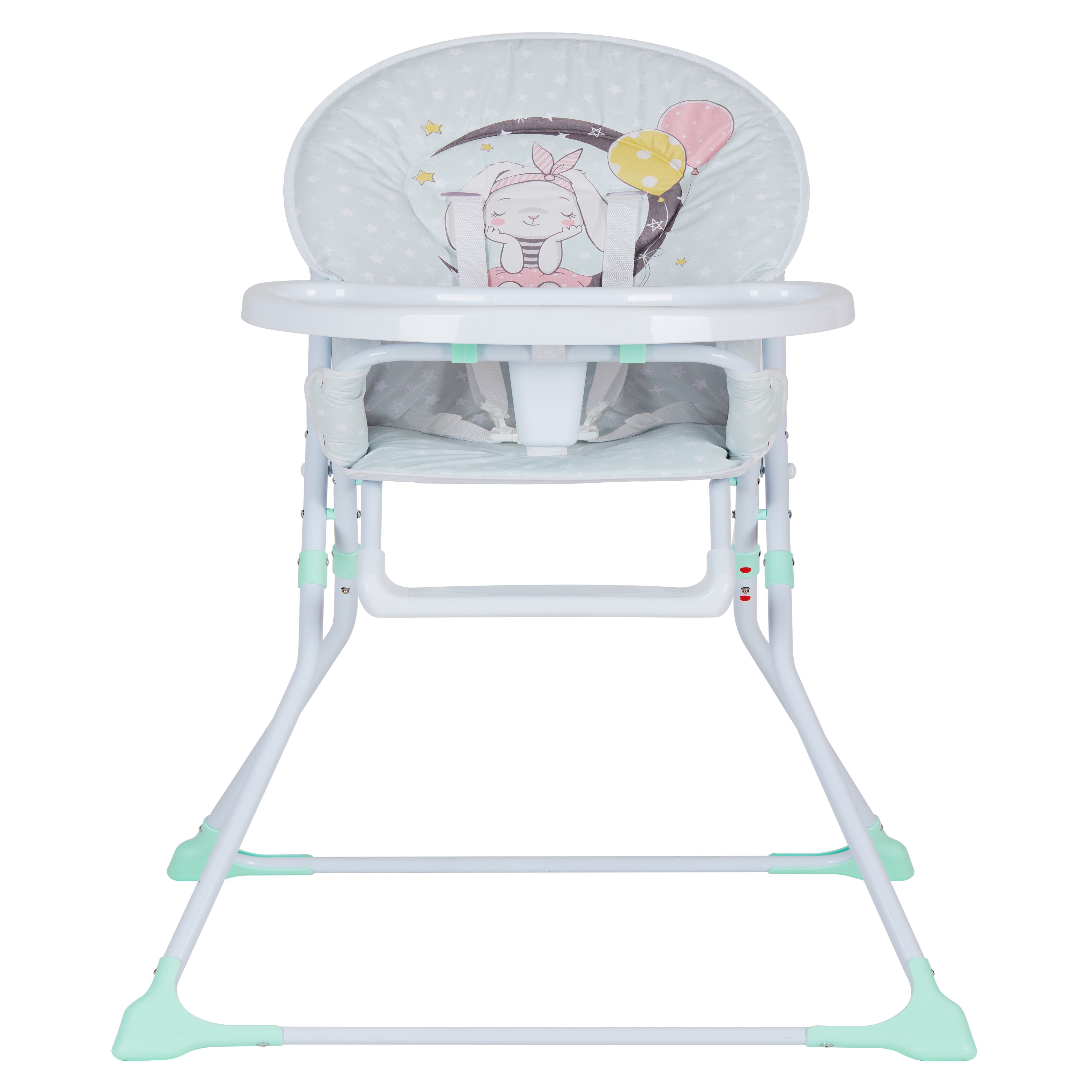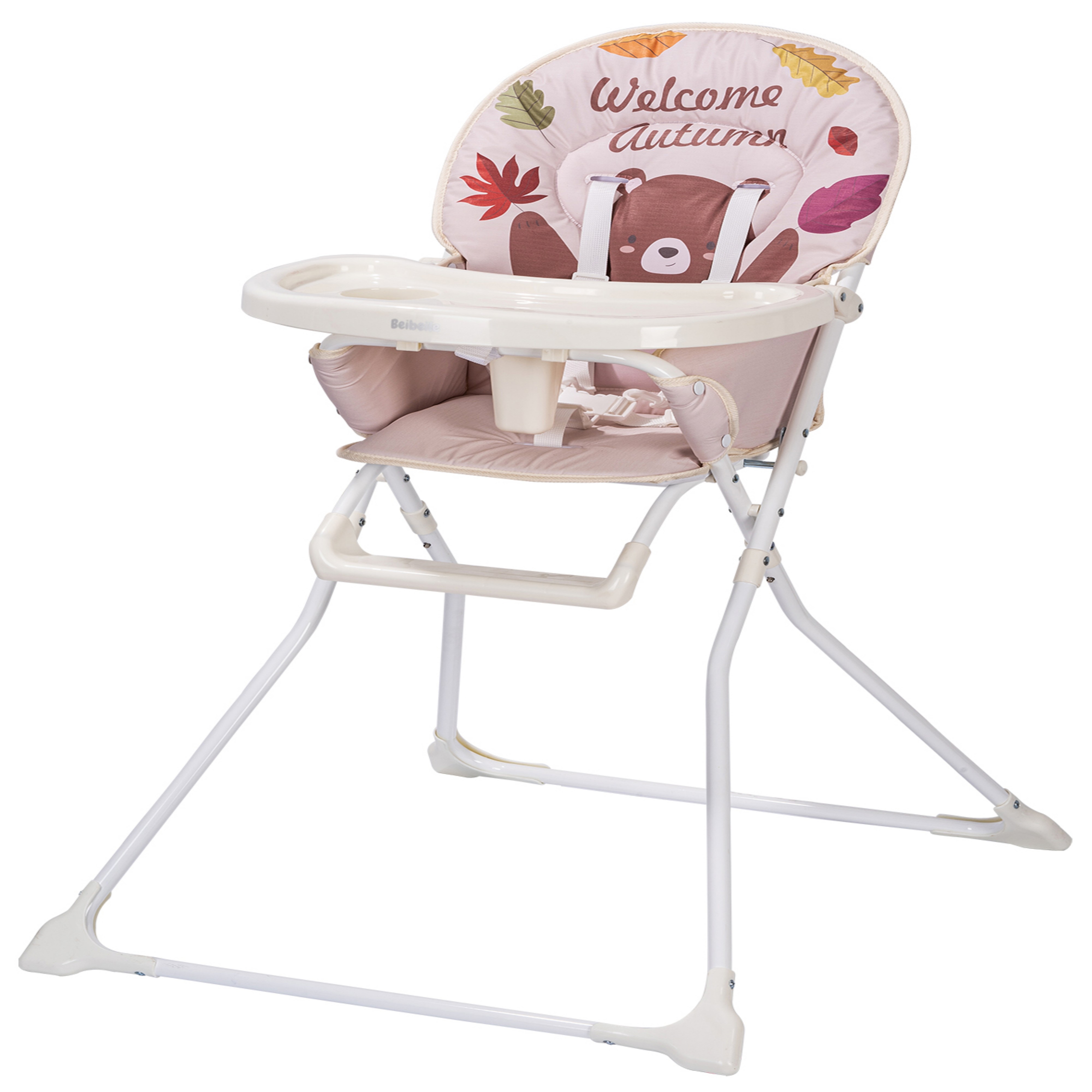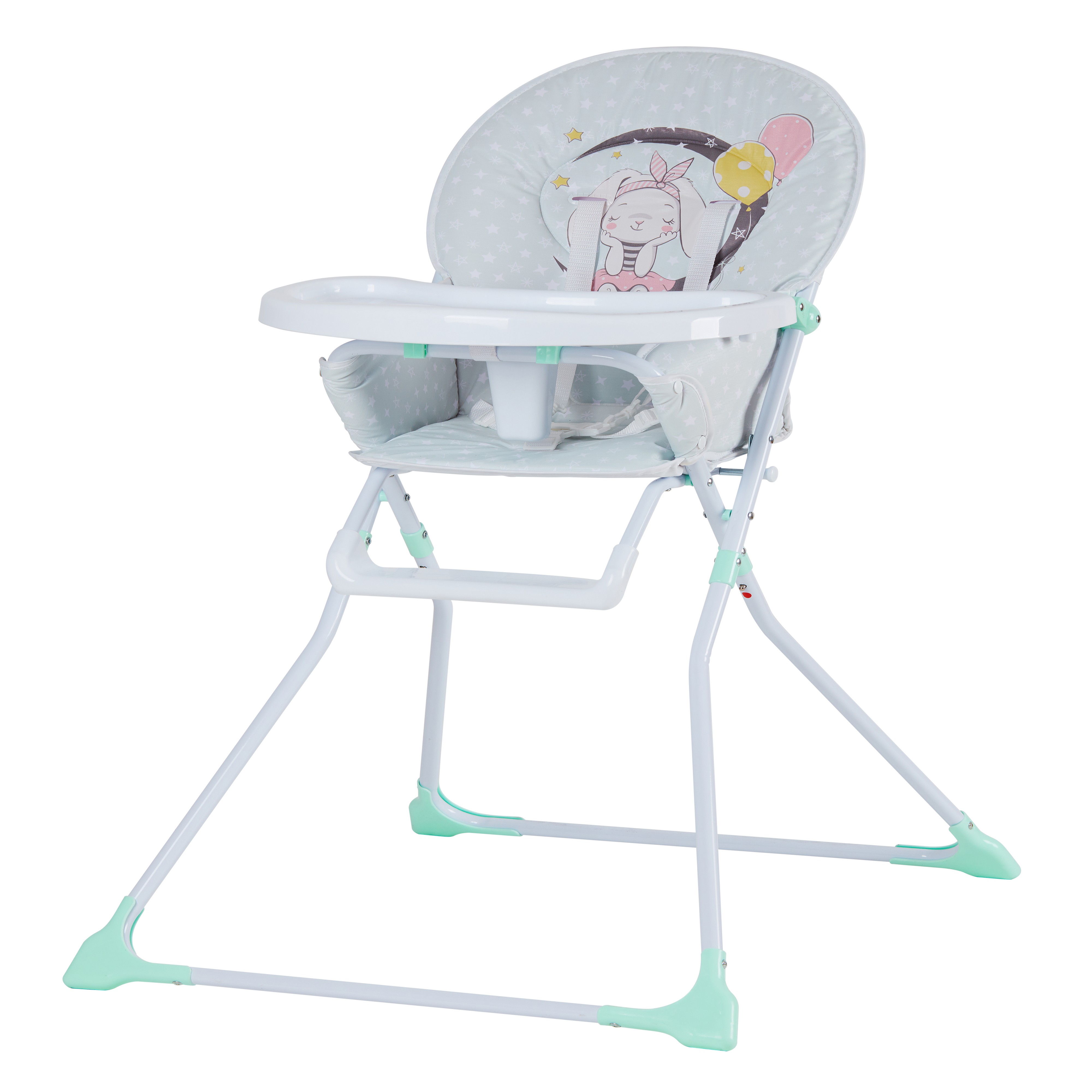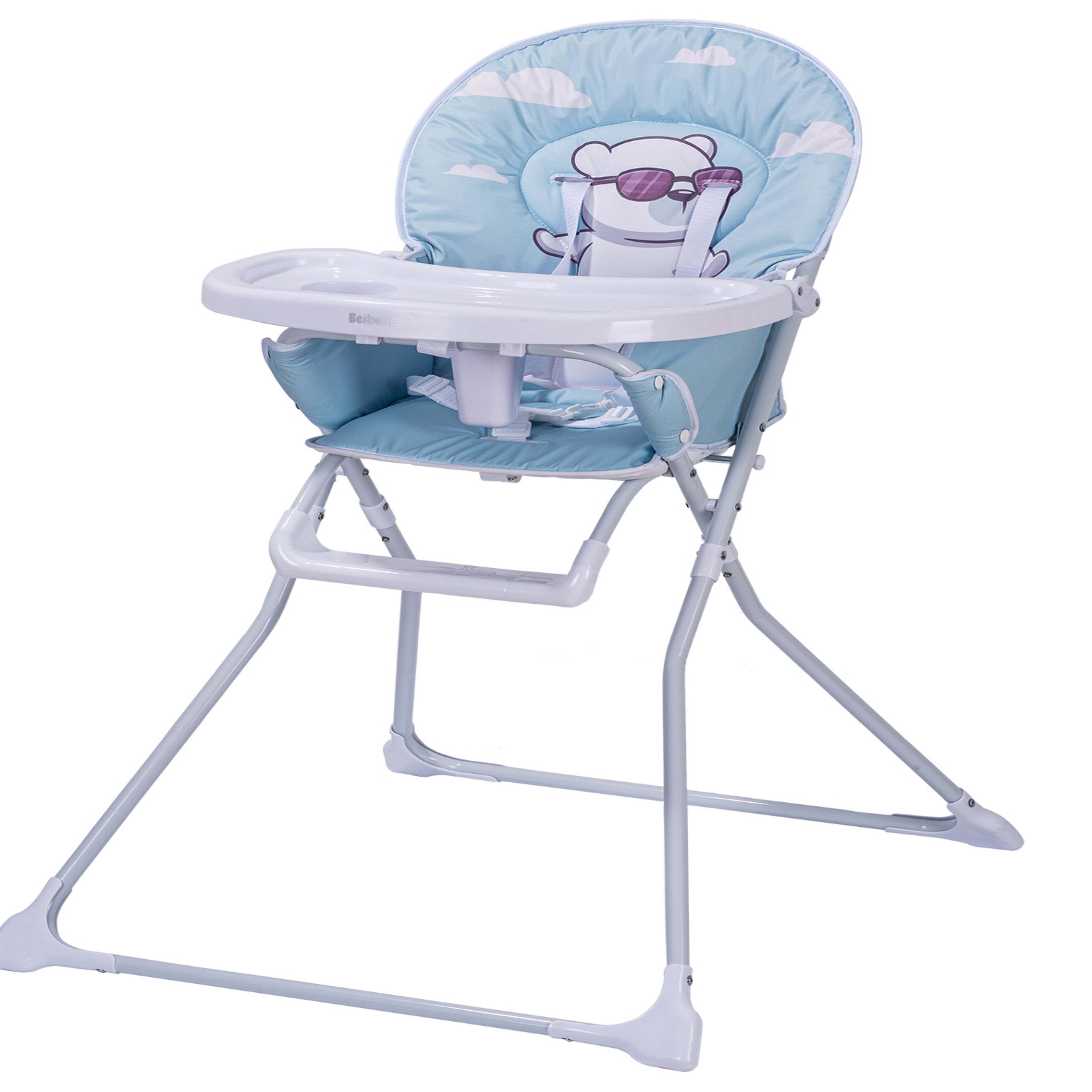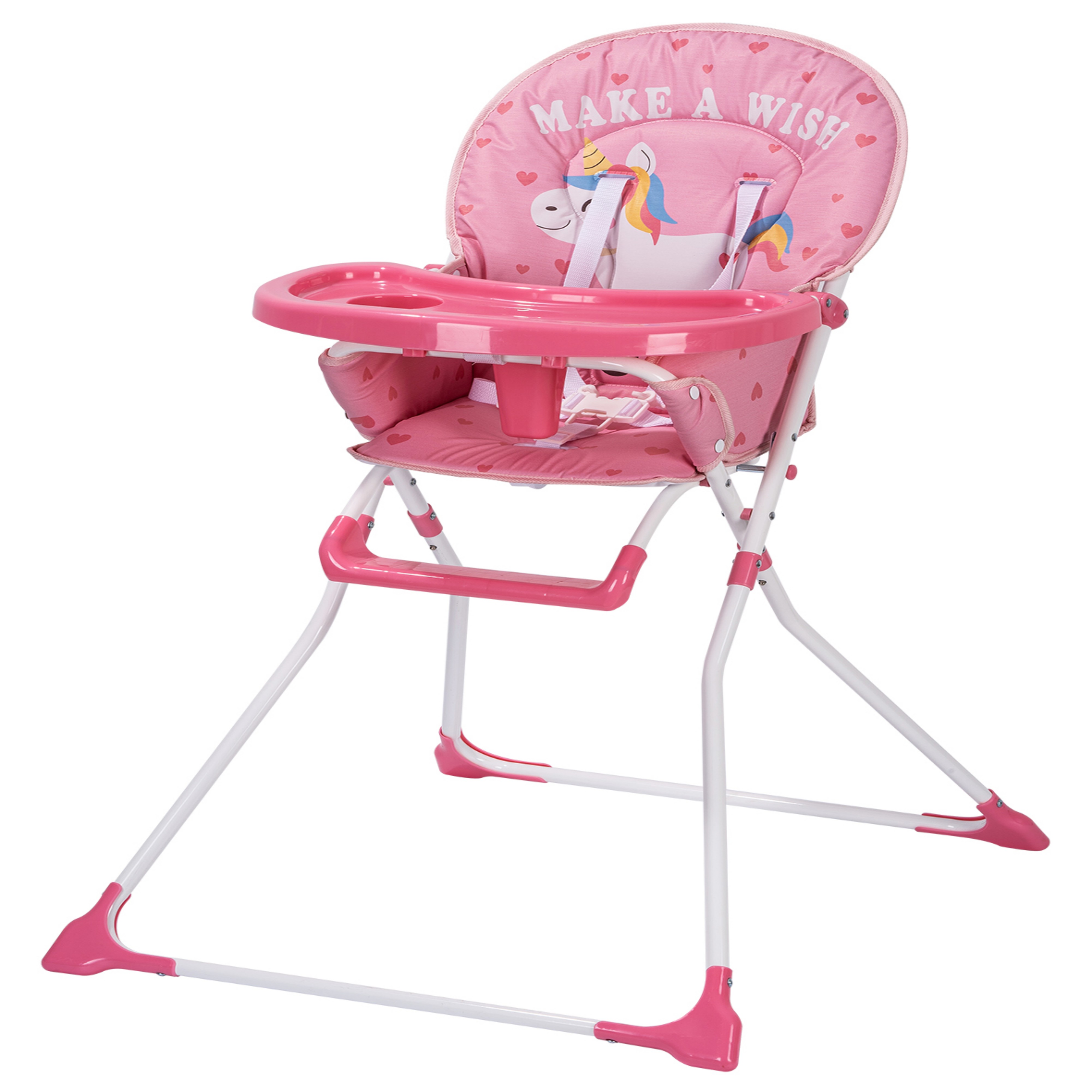 Wide based stable design, front big tray , Integral 5 point safety harness, Removable washable straps Wipe clean seat unit, compact flat fold for easy storage