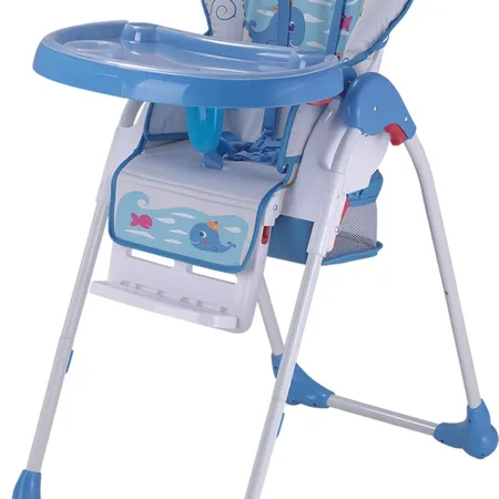 This baby high chair boasts a light green frame with a multi-colored printed seat. The padded seat with an adjustable backrest promises a snug sitting experience. The front tray with a cup slot allows convenient feeding.