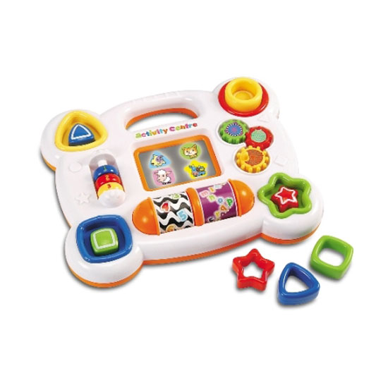 This baby learning toy contains several play elements. Babies can move the counting tools up and down, slide the gear wheel forward and backward, and place the shape blocks to the matching slots. It is a wonderful toy to develop babies' intellectual ability and hand-eye coordination.
