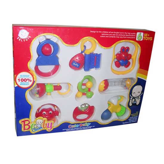 The baby rattle set comes in 9 pieces of different adorable designs. These baby rattles are specially designed for small hands. This colorful rattle set makes a great baby gift.