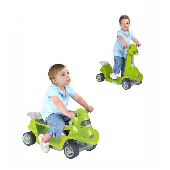 • The item is an independent ride-on toy that transforms into a stable 4-wheeled scooter.