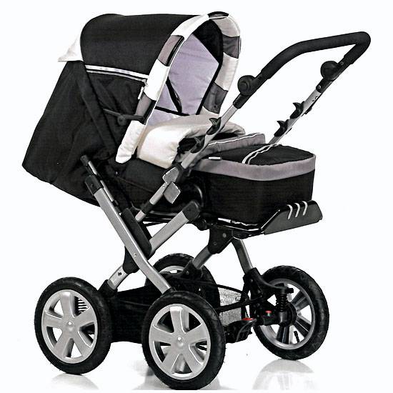 The baby stroller features a detachable handy pram and a reclining seat with a safety harness. The large wheels allow zippy movements in all directions. Go out with your baby with this deluxe baby stroller.