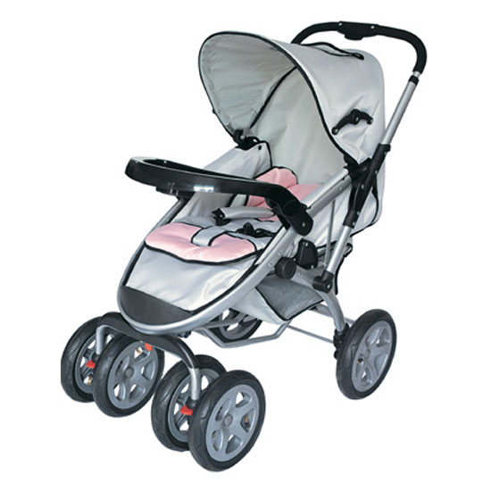 Featured is a baby stroller designed with adjustable handles. The suspension front wheels can move in every direction. The backrest can be adjusted in three different positions.