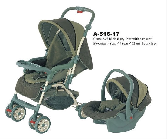 Showcased is a high performance stroller that comes with a car safety seat. The canopy keeps sensitive skin in the shade and the seat is comfortably lined with cushiony mat. The press button at the handle increases maneuverability during strolling. A tray with cup holder and a roomy mesh basket offer extra convenience.