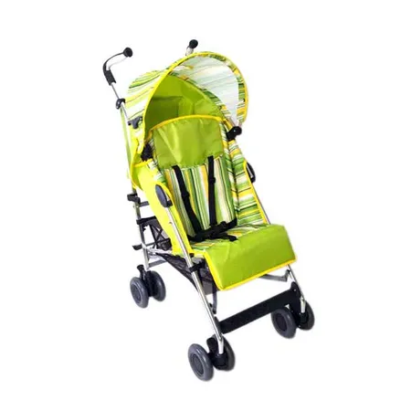 This displayed baby stroller is meticulously designed with an aluminum-frame construction for enhanced durability. The 360-degree swiveling front wheels allow easy maneuverability. It comes with an adjustable canopy for blocking strong sunlight from discomforting the babies’ eyes.