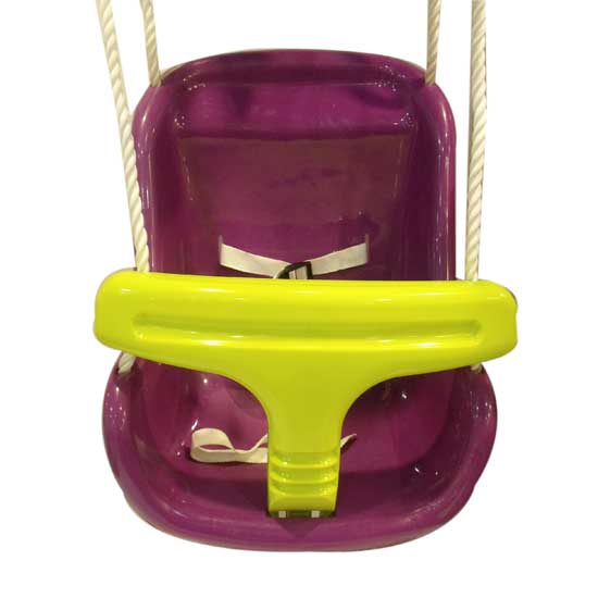 This displayed swing is designed for babies to play with. The purple hue adds a refined touch to the swing. It is made of plastic for lasting use.