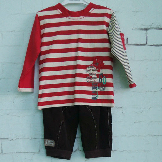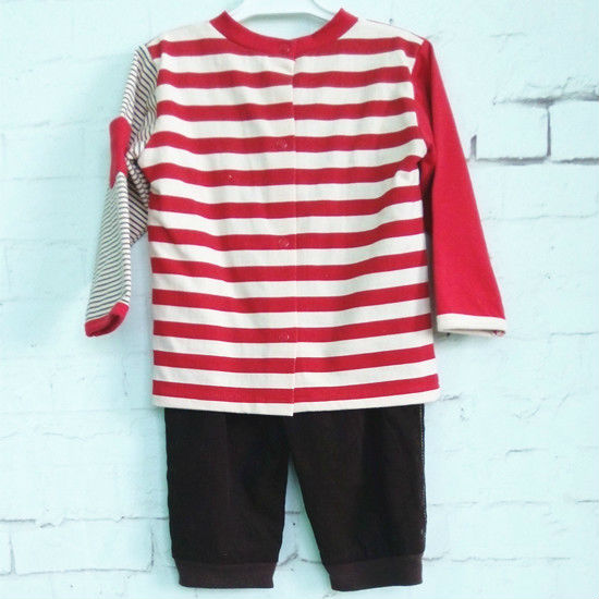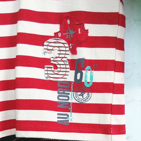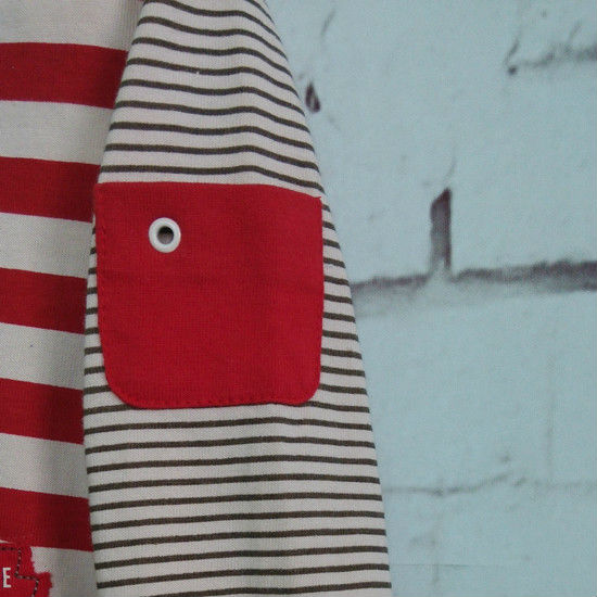 Left sleeve with small stripe pattern contrast with plain colour on the right