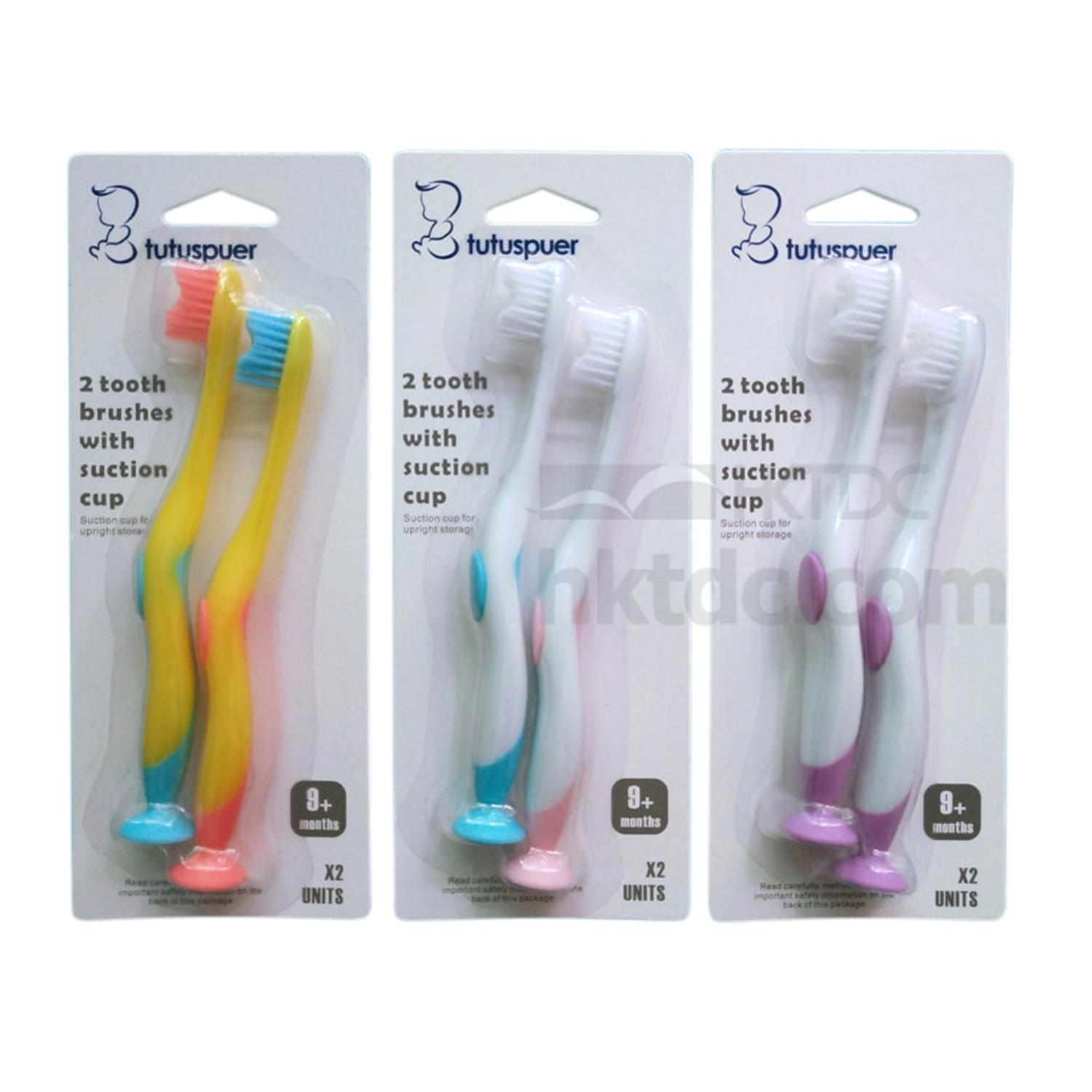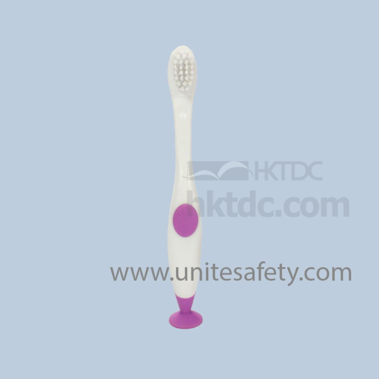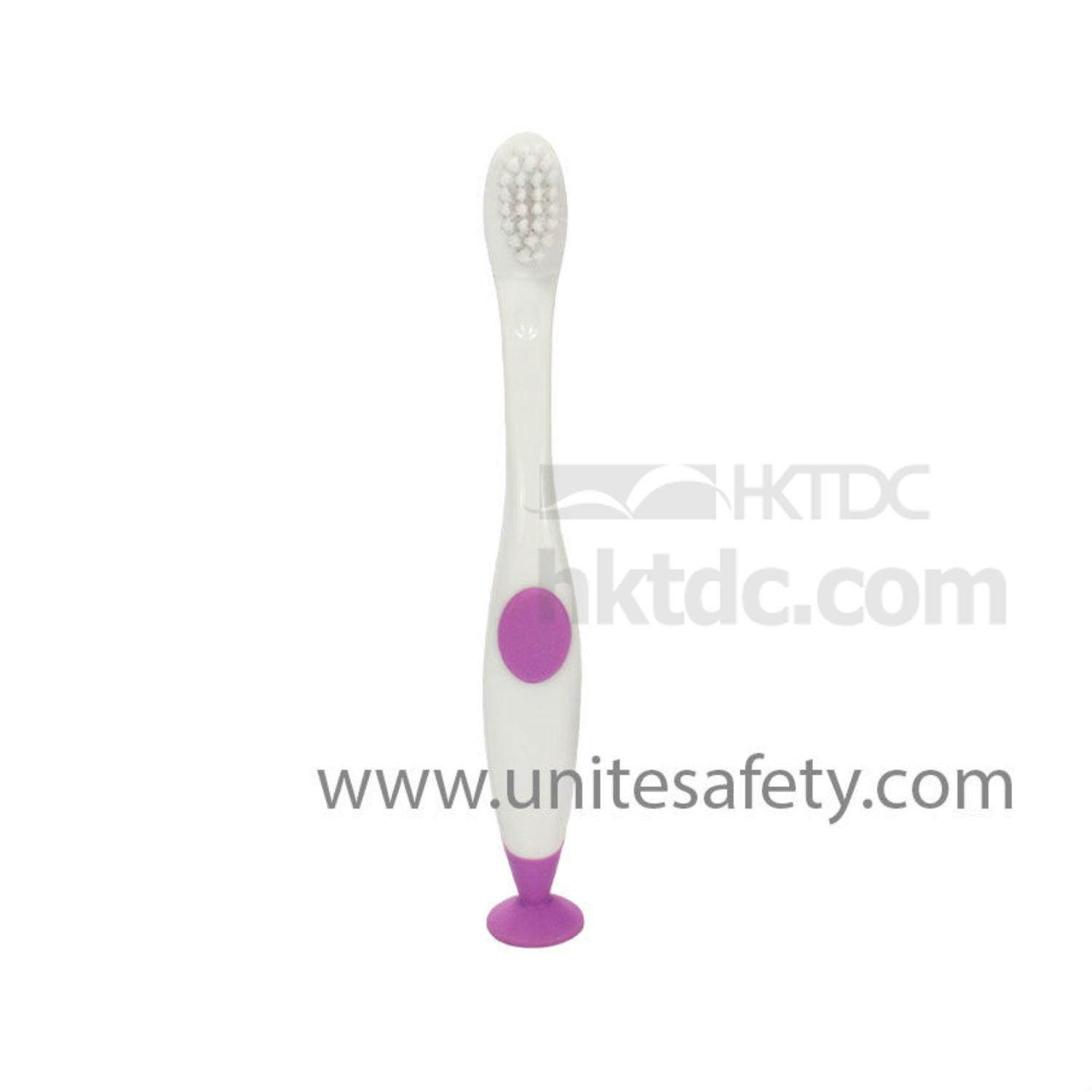 Highlighted here is a baby toothbrush with suction cup mount designed for children 9 months and up. It has extra soft bristles that are gentle on young and sensitive gums and has a TPE handle with thumb pad to provide a comfortable grip. The suction cup base can hold the toothbrush upright and keep the bristles dry and clean.