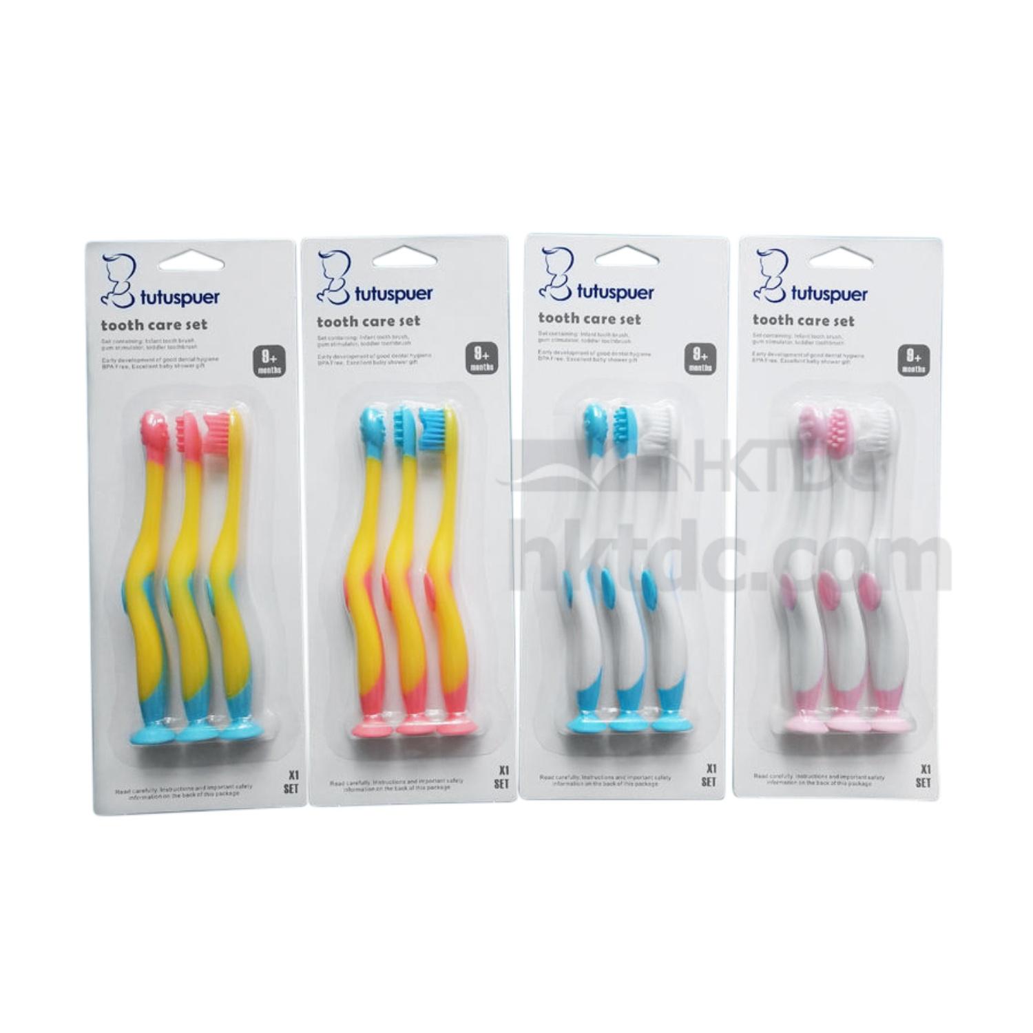 Develop good oral hygiene habits from a young age with this 3-piece tooth care set. The set includes an infant toothbrush with soft bristles, a gum stimulator for massaging and cleaning gums during the teething process, and a toddler toothbrush for toddlers with teeth. They come with suction bases for keeping the bristles dry and clean and are excellent as baby shower gifts.
