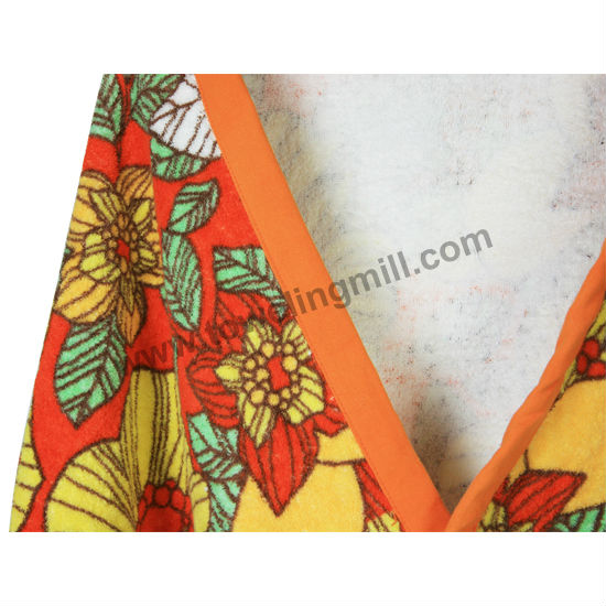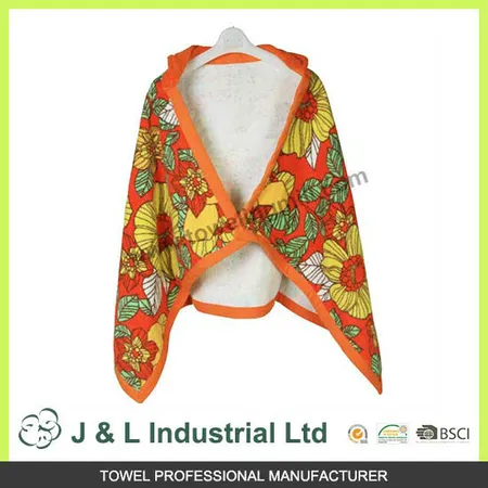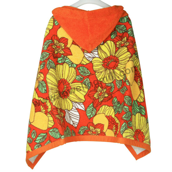 Shown is the bath cape with a bold and lively-looking floral print. With the hooded design, this bath towel also comes with a matching orange color fabric wrapped rim, promising for durable and longer lasting uses. With terry finishing on both sides, this towel cape would ensure with great absorbency at all time.