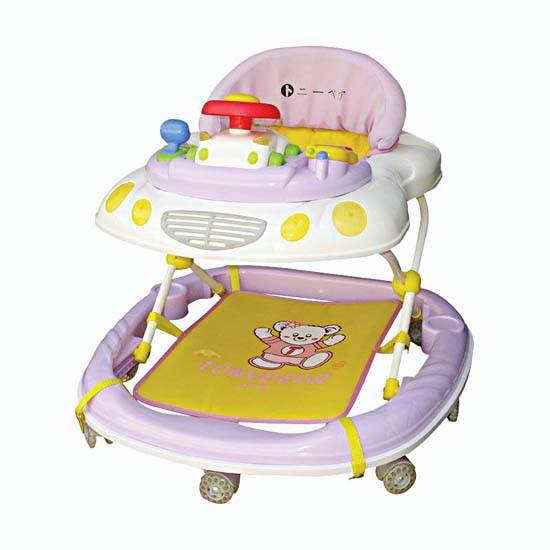 This purple-and-white baby walker features a padded seat for a comfortable ride. It comes with an activity tray on the front to entertain your baby. The 3 height settings allow the walker be adjusted according to your needs.