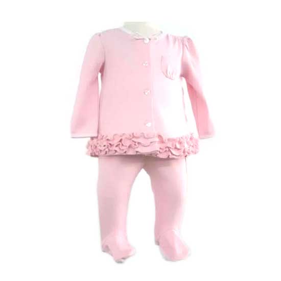 This baby's suit features a lovely pink color. The jacket features a buttoned front with a ruffled hem. The top-quality suit is made from 100% cotton for exceptional softness and comfort.