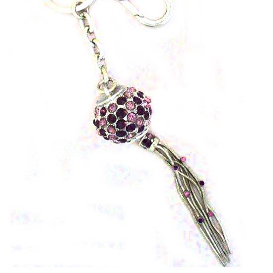 This is a bag charm which is decorated with silvery metals and purplish coloured sparkling stones.