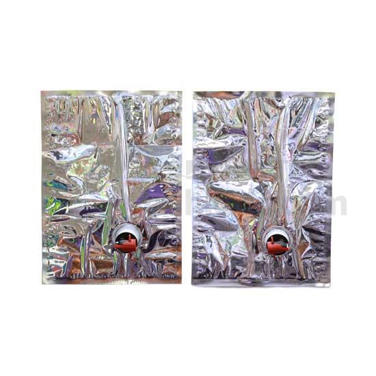 Displayed is a water bag made of aluminum for a superior maintenance of the freshness of your drink. Featuring a tab at the bottom of the bag, this water bag is easy to use. This water bag can be hung on the wall and act as a drink dispenser.