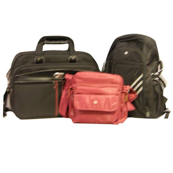 These are bags which include a backpack or knapsack, a handbag and a briefcase. The briefcase has both shoulder strap and hand holder for holding documents or a laptop.