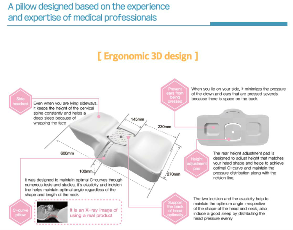 Dr.Shin’s Balance Care Pillow is leading the paradigm change of pillow usage, it is essential to maintain it in the C-shaped curve to make the most of the spring effect to distribute the weight of the head. Your health is hidden in your 8-hours of sleep each day where your neck bone can be restored.