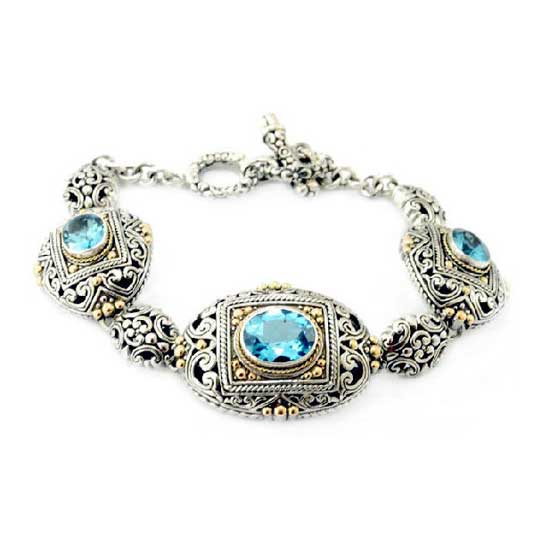 This Bali two-tone ring features a whimsical design with intricate and detailed work. The charms are meticulously crafted with light blue gemstones for extra glamor. This chic gemstone bracelet is an ideal gift for your beloved one on special occasions.