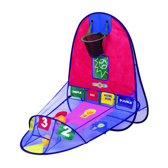 This is a ball game called "3,2 and 1 Sport Center". It contains 3 ping pong balls and a pop-up tent built with a play arcade and a hanging basket for ball casting. The game is easy to play and good for family and indoor activities.