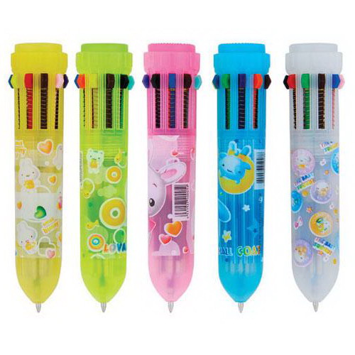 This multi-color ball pen has a plastic body and offers 10 colors to write and draw with. It has a wide barrel and is adorned with cute patterns on the barrel. The ball pen is suitable for school or office uses and will make an excellent promotional gift.