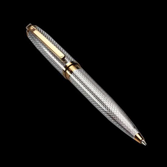 This stylish ball pen features a streamlined metal barrel with embossed patterns. The ball pen showcases glossy silver plating with 22K yellow gold trimming. The ergonomic ball pen provides exceptional writing comfort and control.