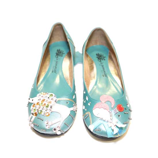 These displayed ballet flats flaunt a dainty sky blue hue for easy mix and match. The cartoon motifs add a lovely accent to the ballet flats. This displayed pair of ballet flats goes great with elegant outfits.