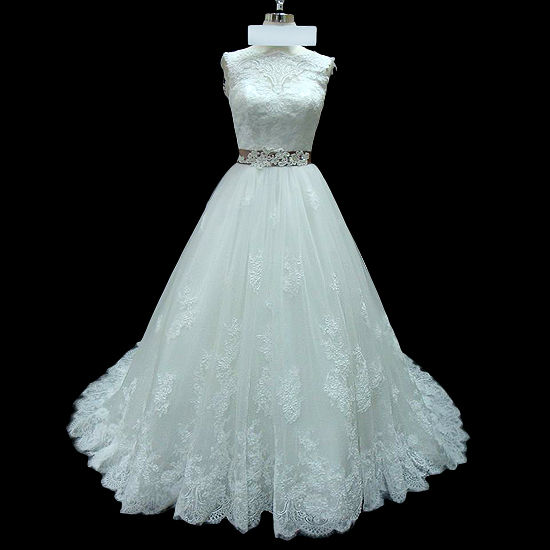• Sweetheart bodice with a high neck sheer illusion collar.