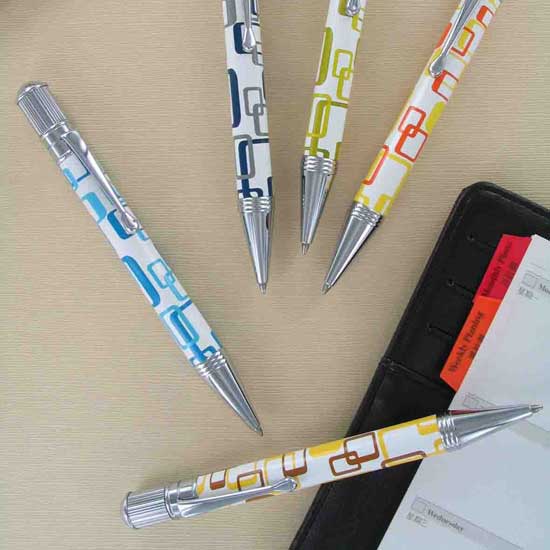 Shown here are a handful of ballpoint pens with attractive classy designs. Their barrels are styled with colorful rectangular-shaped frame patterns. The retractable design prevents tip exposure and the ink from drying.