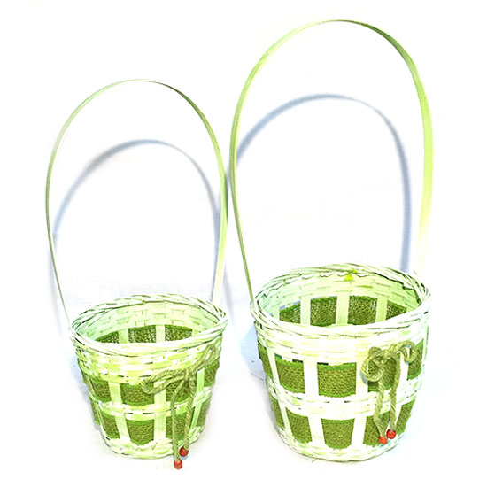 These round bamboo baskets are designed with long handles for a special look. The baskets come in a refreshing green color and with finely-crafted jute details. These lovely bamboo baskets are best used for storing small items like hair accessories, dolls, figures, home fragrances, etc.