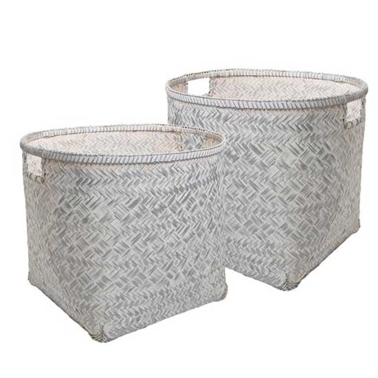 Pictured here is a set of baskets in white wash hue. The bamboo construction presents a rustic charm. This bamboo basket set is suitable for every household.