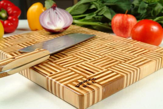Featured is a bamboo cutting board with a stripe pattern. The surface is easy to clean without harboring bacteria. The board will score slightly as not to dull your knife. This cutting board is great for mincing herbs, chopping carrot or even slicing watermelon.