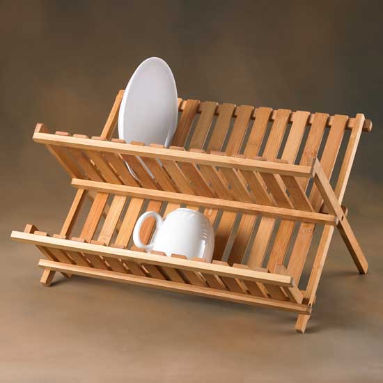 This foldable disk rack is perfect for draining and organizing dishes, cups and bowls. Crafted of natural bamboo, the dish rack is water resistant and durable. The natural bamboo color fits easily into any kitchen decor.