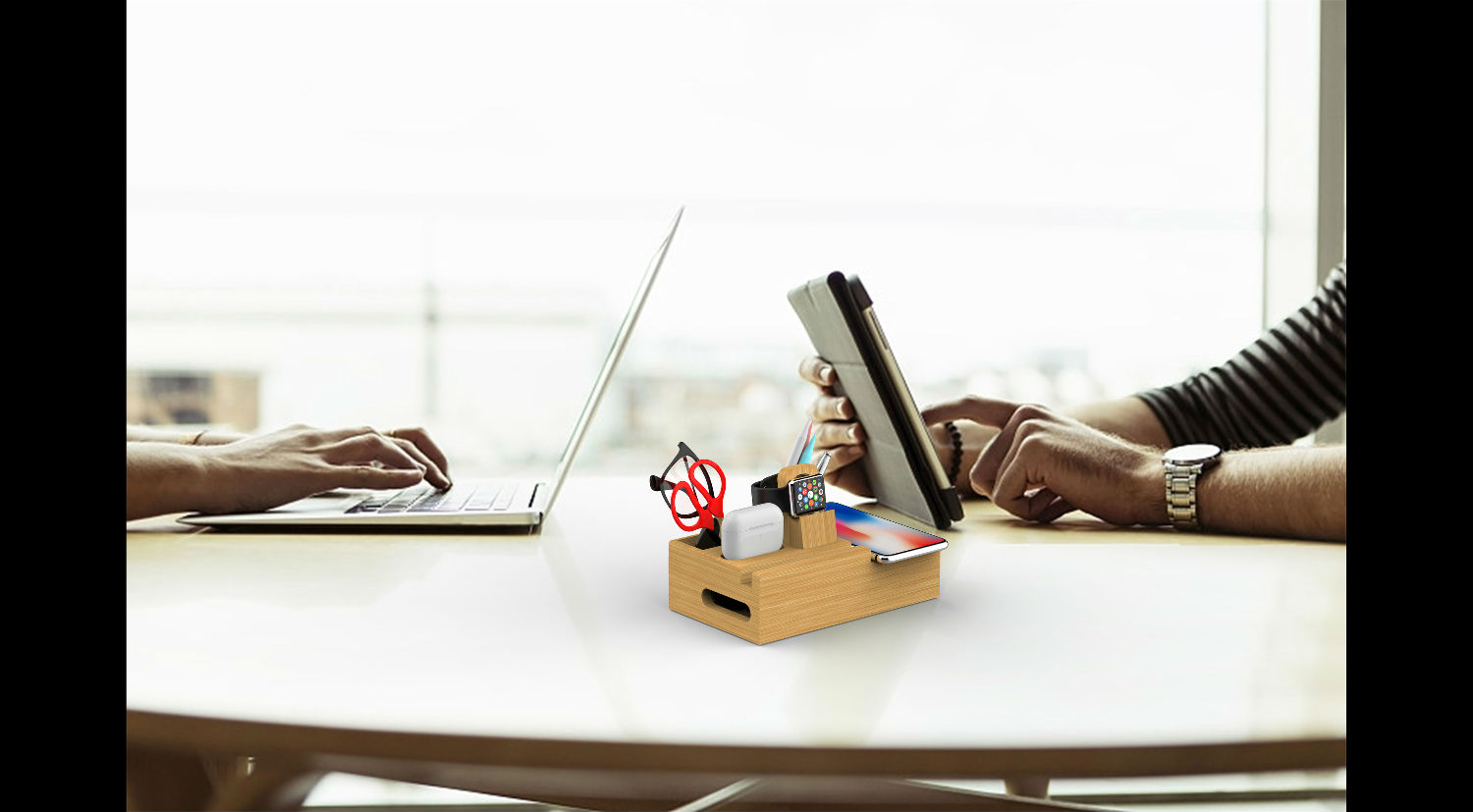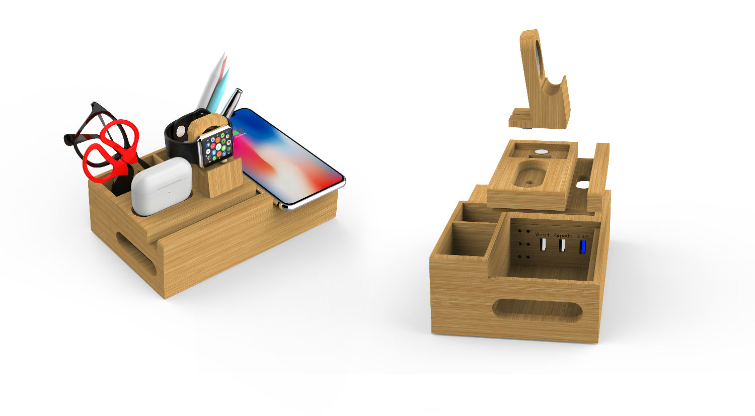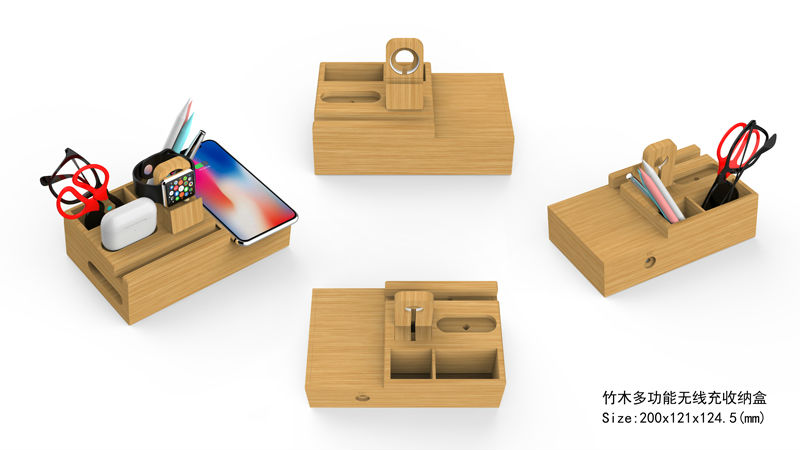 Material: Bamboo Product size:200*121*124.5mm Weight:502g AC adaptor input:12V/2A USB A output1/2/3: 5V/2.4A Wireless output:10W