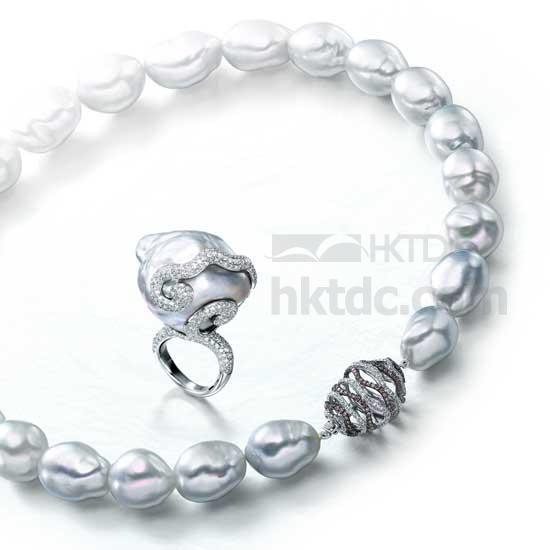 This elegant jewelry set includes a necklace and a ring made of lustrous South Sea Baroque pearls. The finely selected pearls display a natural silvery color. The well-designed set is a great addition to your jewelry collection.