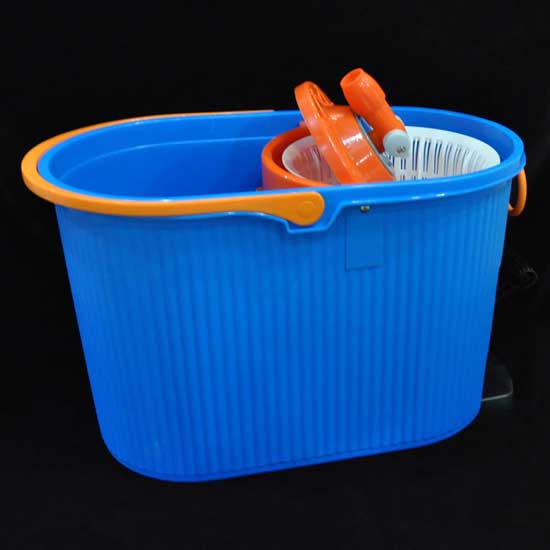 Showcased here is a barrel that is useful for cleaning purposes. It comes with a small partition for squeezing water out of a mop. Made of plastic, the barrel is durable and can be cleaned easily.