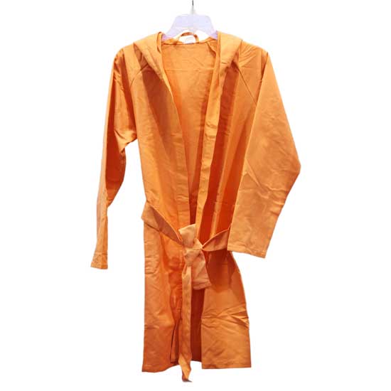 This presented bath robe flaunts a mandarin orange hue. It is made of 80% polyester and 20% polyamide, allowing gratifying wearing comfort. This polyester bath robe is suitable for men and ladies.