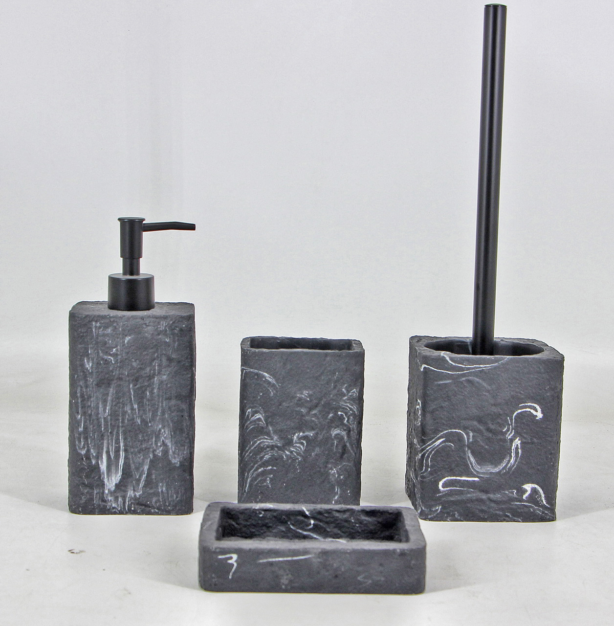 Featuring a toilet brush, soap dispenser, tumbler, and soap dish,