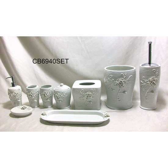 The outlined bathroom accessory set is themed with an elegant rose for added brilliance. The set includes soap dispensers, tissue box holders, soap dishes and a toilet brush. This bathroom accessory set is a useful and elegant addition to modern washrooms.