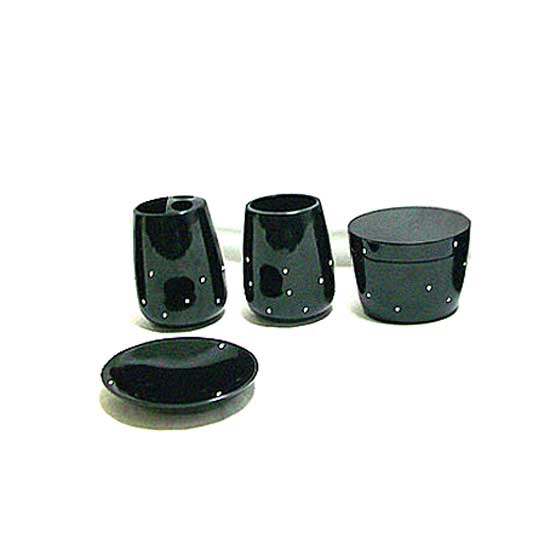 This featured bathroom accessory set comes with a toothbrush holder, soap dish, cup and bucket. Each piece is coated in black with little white spots to add fanciness. This bathroom accessory set is suitable to decorate modern toilets.