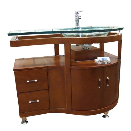 The featured item is a bathroom basin completed with a cabinet. The basin is made of tempered glass, and is installed on top of a wooden cabinet, giving it a stylish and elegant design.