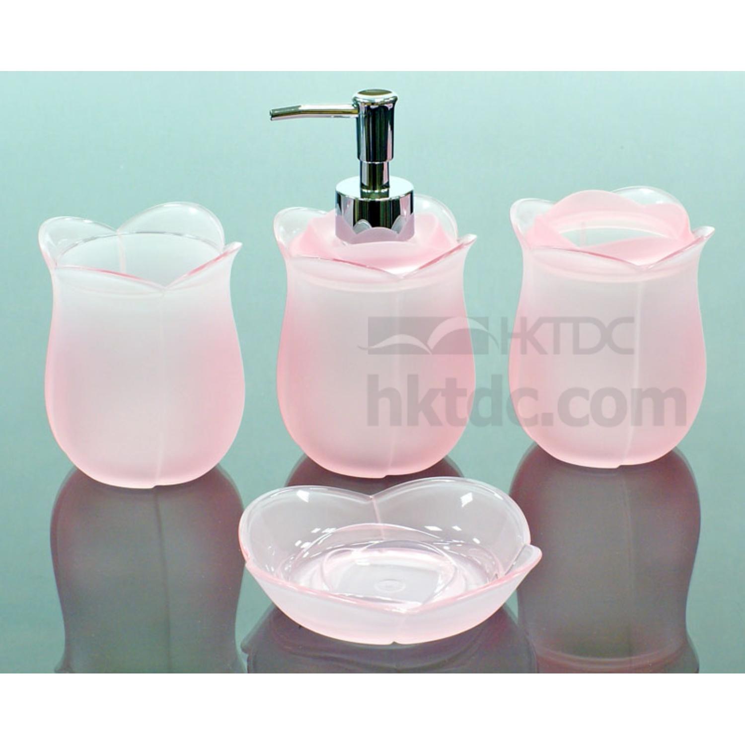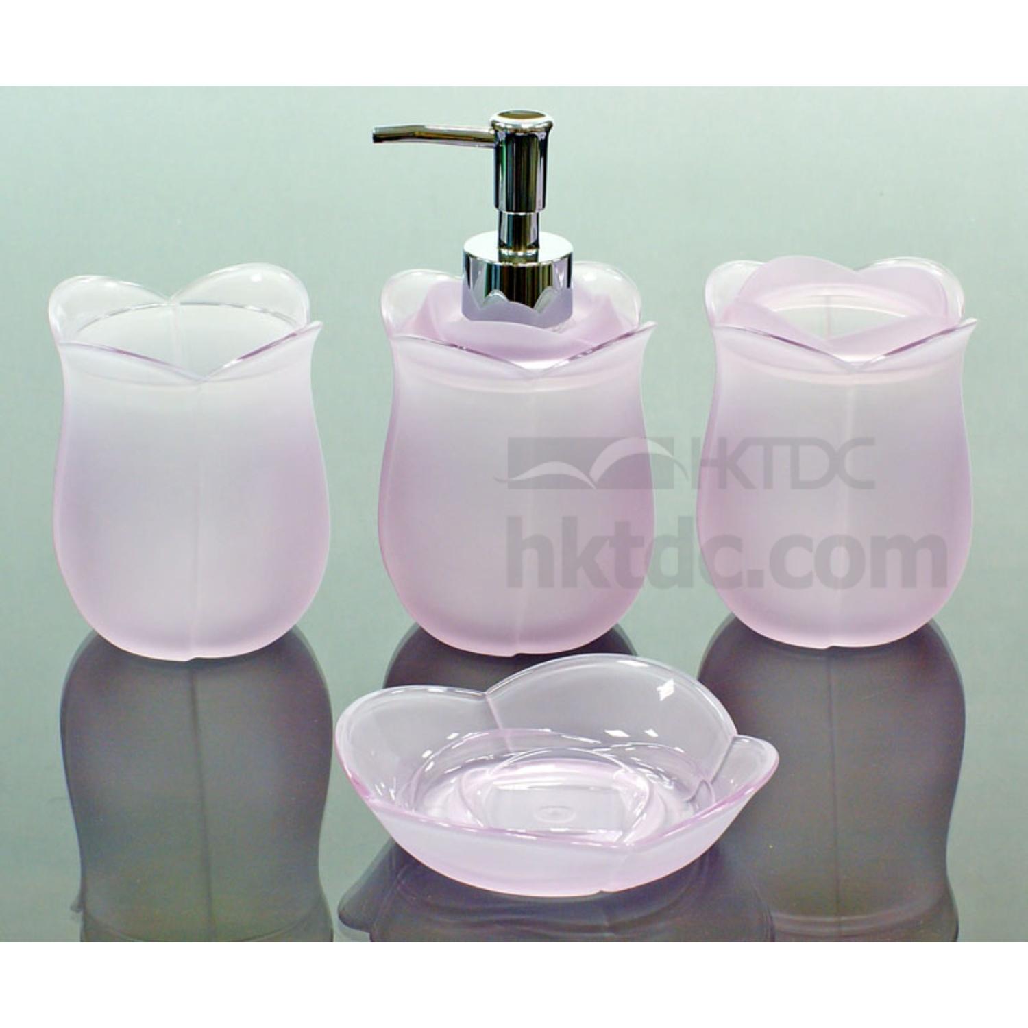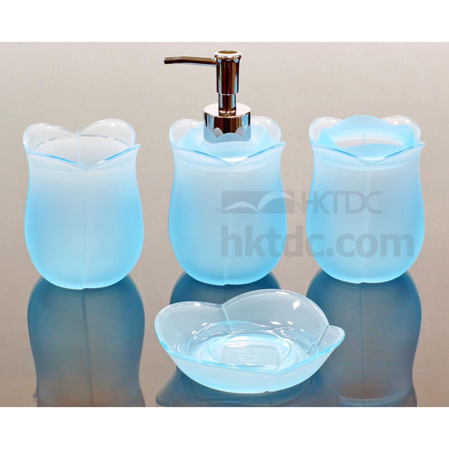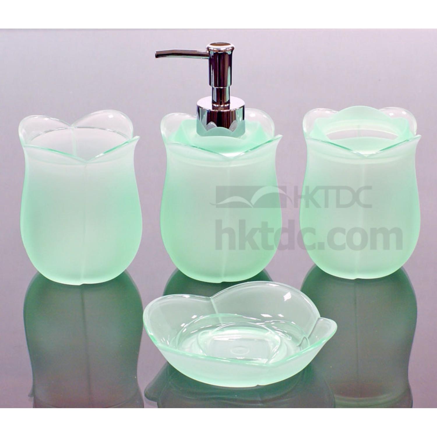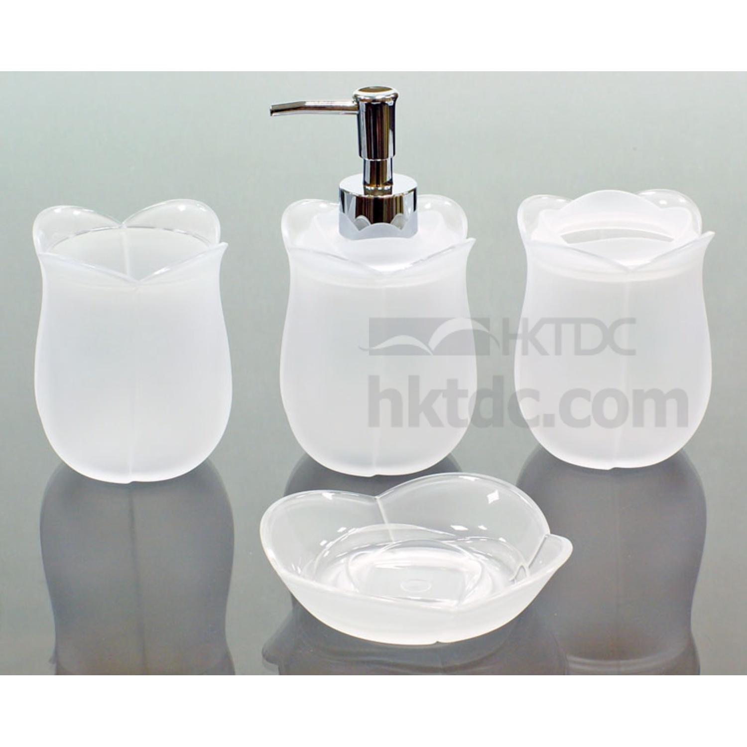 The set of lotion dispenser, toothbrush holder, soap dish and mug is made of acrylic plastic.