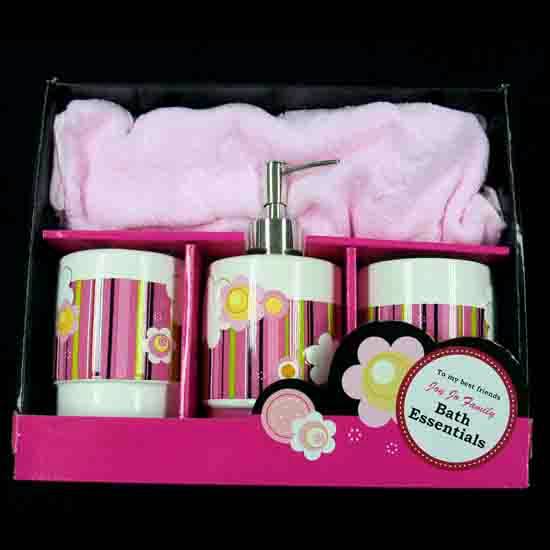 This beautiful bathroom set includes 2 tumblers, a lotion pump and a towel. They boast pink flower and stripe patterns all over for a hint of uniqueness. This gorgeous yet functional bathroom set makes a great gift idea.