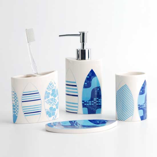This tasteful bathroom set includes a toothbrush holder, a liquid soap dispenser, a soap dish and a tumbler. Crafted of white ceramic, the exquisite bathroom set is accented with refreshing blue motifs on their bodies. The modern bathroom set can easily integrate into any bathroom decor.