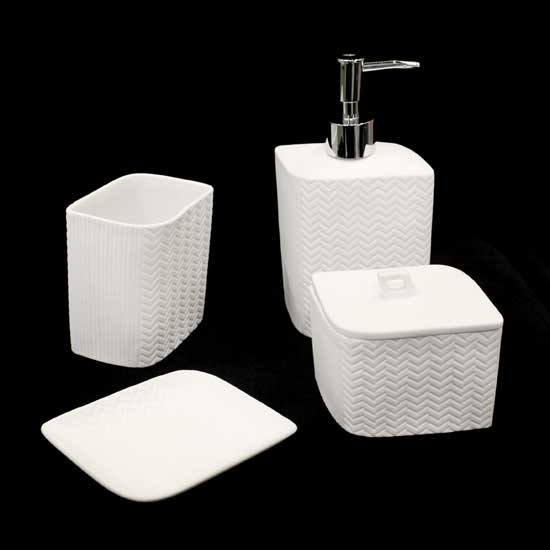 This high-quality bathroom set includes a liquid soap dispenser, a soap dish, a holder and a lidded pot. Each piece features a zig-zag pattern on the surface. This set is an ideal addition to your modern bathroom.
