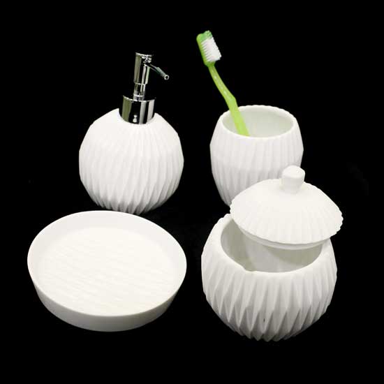 This porcelain bathroom set includes a tumbler, a soap dish, a liquid soap dispenser and a lidded pot. Each piece in the set comes with a zig-zag patterned finish. The high-quality bathroom set offers style and practicality.