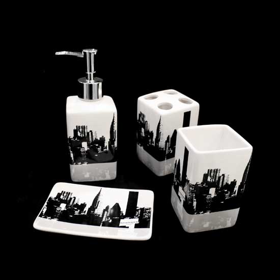 This four-piece ceramic bathroom set includes a liquid soap dispenser, a toothbrush holder, a soap dish and a tumbler. The ceramic bathroom accessories spotlight modern city graphics on their bodies. The delicate bathroom set will immediately surely enhance your bathroom decor.