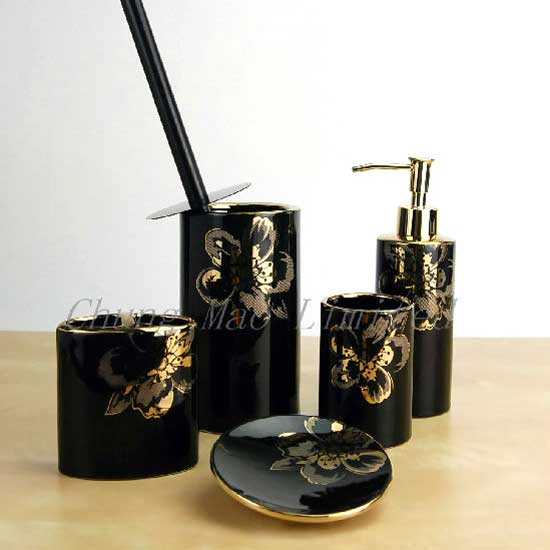 The Elysees bathroom set will add a touch of elegance and luxuriousness to your bathroom. It comes with 5 different pieces in a set. Each piece features a deep black body with shiny golden floral patterns.